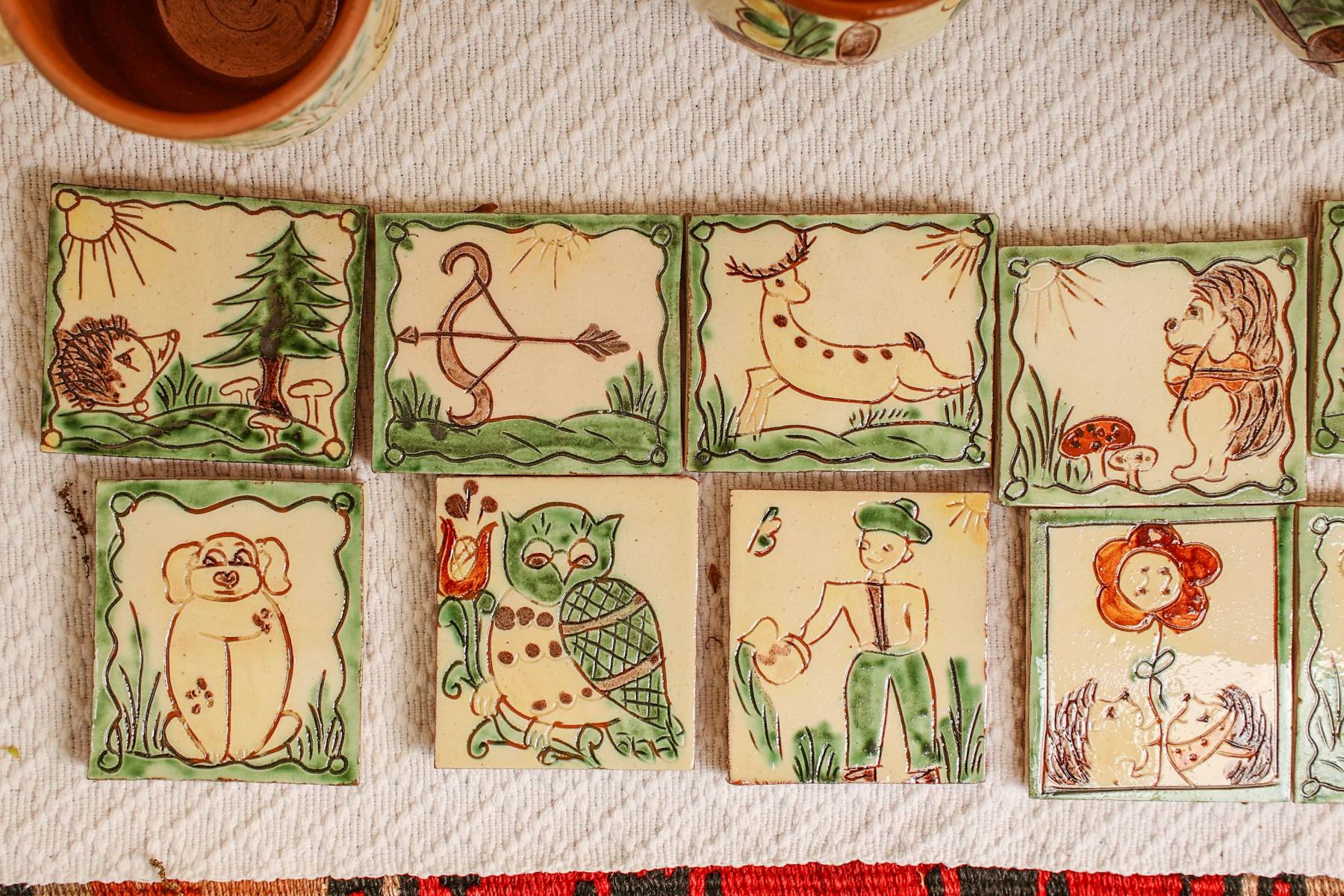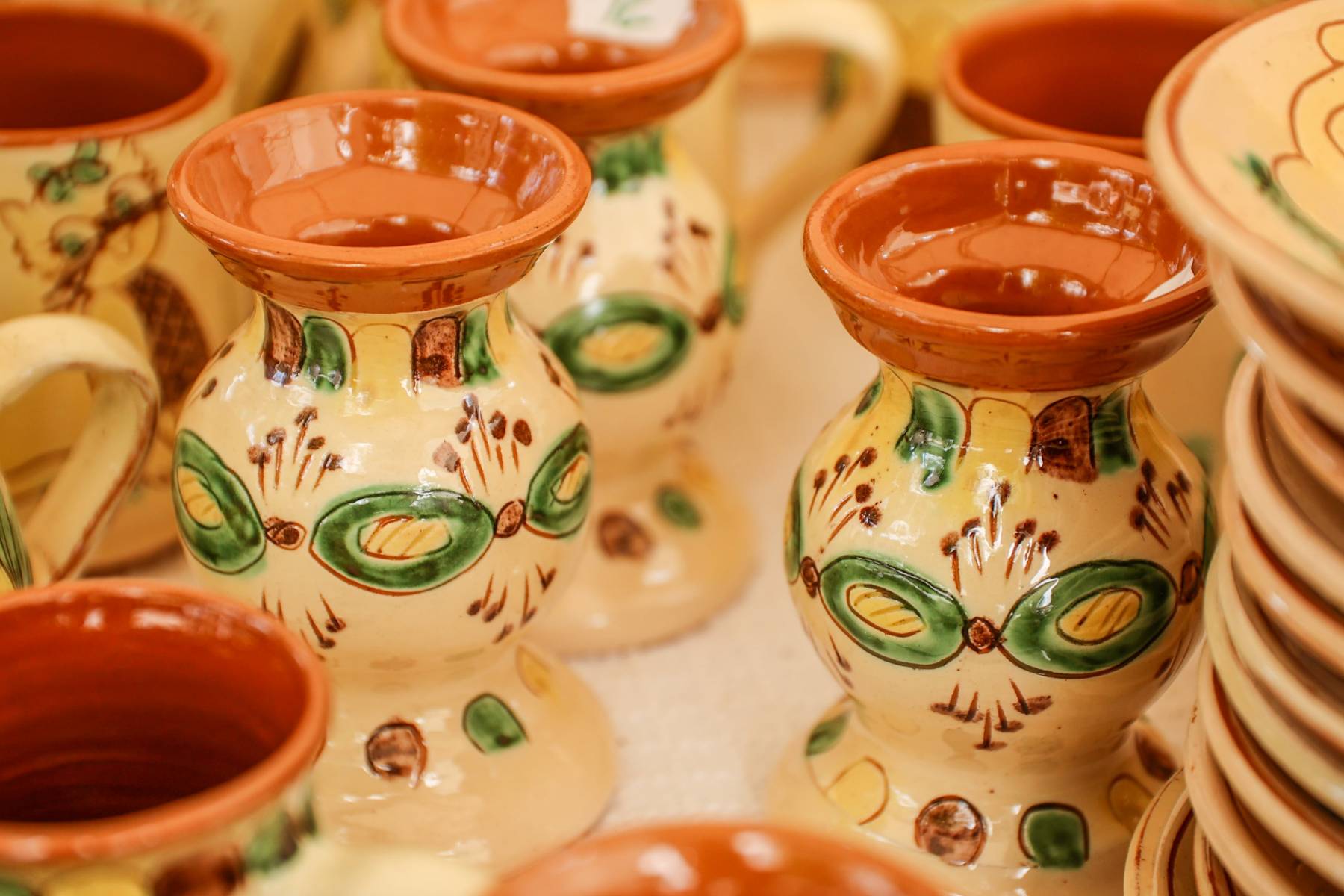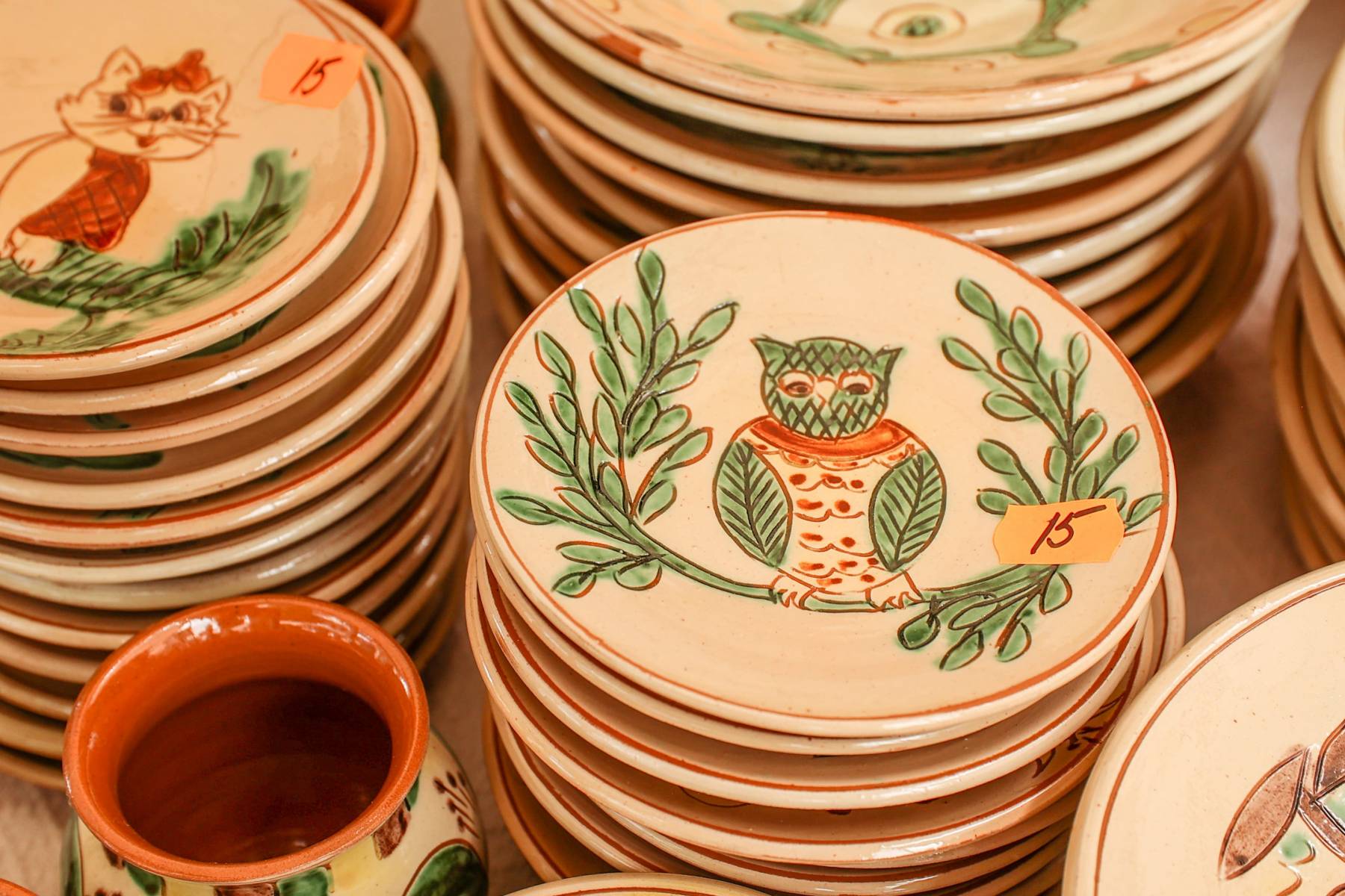 Produsele acestei categorii de ceramică au la bază desenul naiv stilizat și o gamă cromatică alcătuită din tonuri de verde, galben și brun (cafeniu) pe fundal alb-ivoir angobat, reprezentând cele patru anotimpuri ale anului. Arderea se face în cuptor la aproximativ 1.000°C și este o etapă dublă, realizată înainte și după etapa de smălțuire, aceasta din urmă precedând etapele angobării, sgrafitării și pictării vaselor.